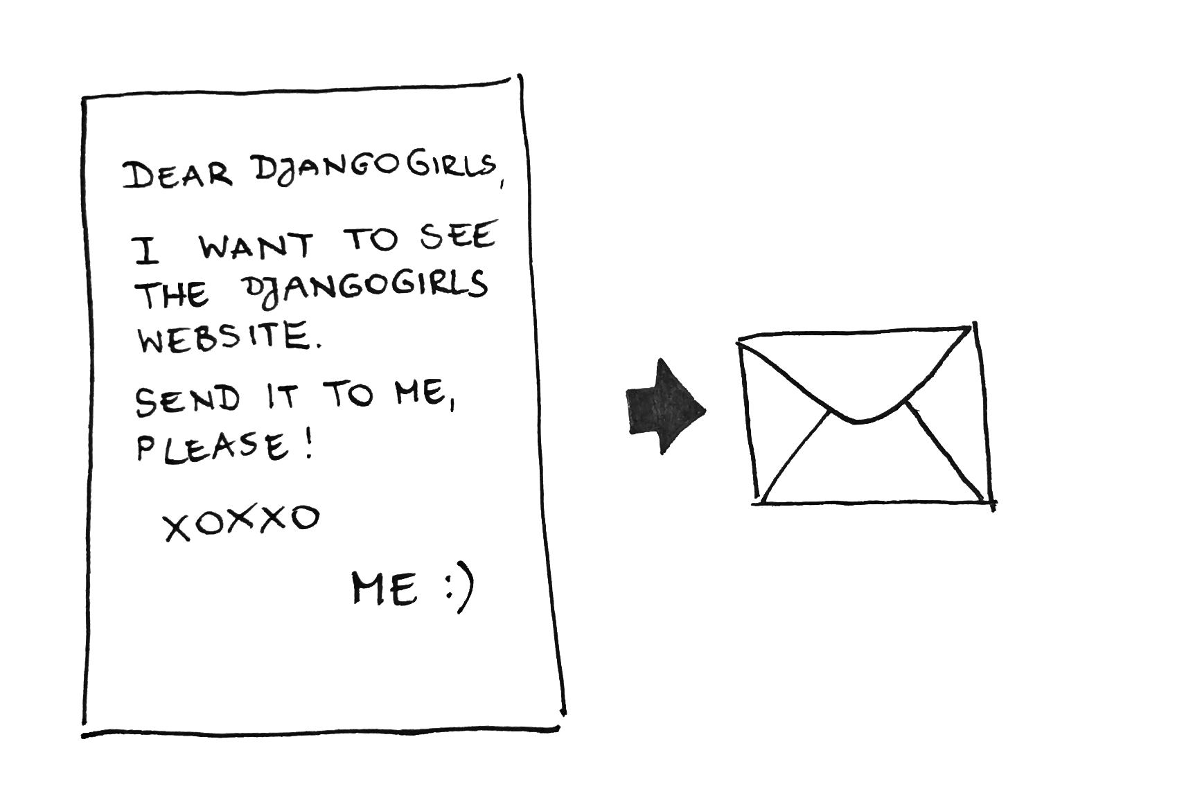 주소창에 https://djangogirls.org 을 입력하는 건, "사랑하는 장고 걸즈 여러분, 저는 장고걸즈 웹사이트를 보고 싶어요. 저에게 그 웹 사이트를 보여주세요!"라고 편지를 써서 보내는 것과 같아요.